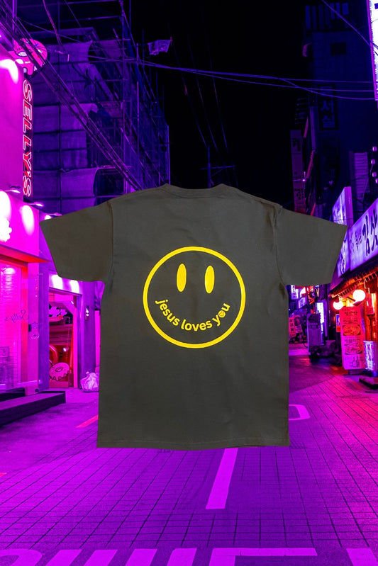 Soft Black cotton “SMILE. Jesus Loves You” w/8-bit heart